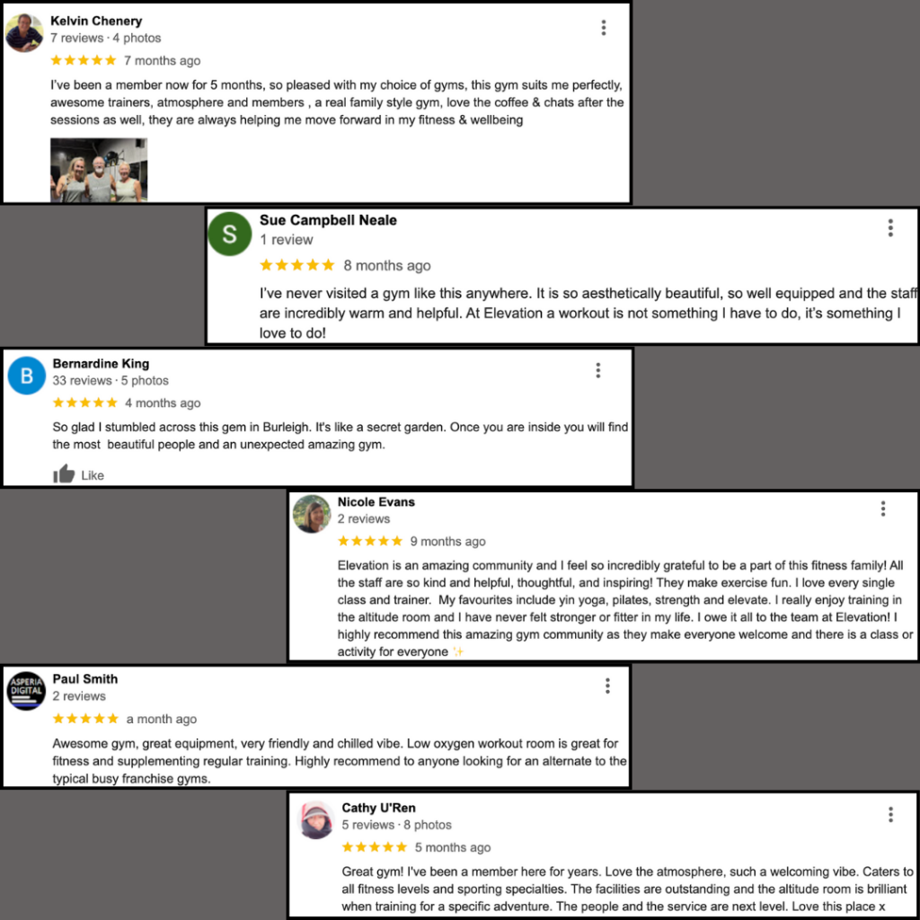 Elevation is a boutique Burleigh Heads gym set in a truly unique space where you always feel welcome to workout. Combining a fully equiped gym plus group classes, altitude training and personal coaching with access from 4.30 am to 10 pm, 365 days a year.